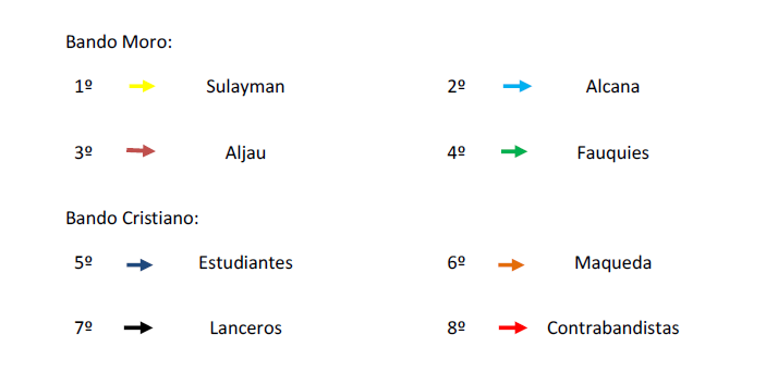 Cuando lleguemos a la Plaza Mayor los Sultanes y Reyes se quedarán en la puerta del Ayuntamiento Viejo. (Sultanes a la izquierda y Reyes a la derecha). Los Capitanes y Abanderadas se irán quedando al lado de sus cargos, cuando termine el desfile los cargos pasaran al centro del pasillo para mover las banderas.