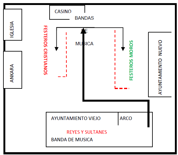 Las comparsas harán el desfile con pasodoble, al llegar a la Av. De la Constitución (Pastelería Asencio) se cambiara: El Bando moro a marcha mora y el Bando cristiano a marcha cristiana o pasodoble.